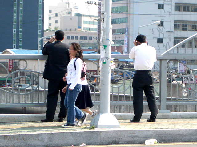 3. 난간에 팔을 걸치고 여유롭게 통화하는 검은옷과 한 발 떨어져서 옹색하게 가려가며 통화하는 흰상의의 남자.