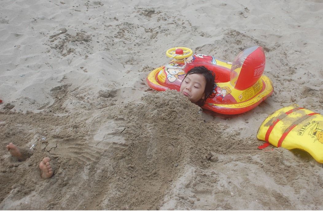 정훈이는 심심하다구 해서 덮어주었죠. 모래를..