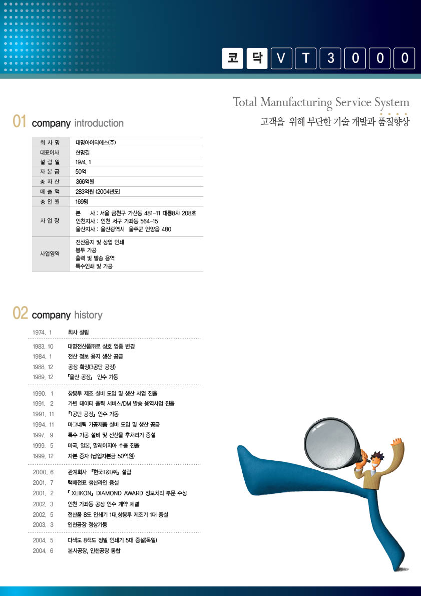 코닥VT3000을 알아보니 인쇄기를 말하는군요. 그리고 전반적으로 이회사가 인쇄에 관련된 일을 주로 하는 것 같는데..이번에 코닥VT3000을 증설하는 것으로 보입니다. 이런 의미로 브로슈어를 만드는 것 같는데 아무래로 표지는 이회사를 대표하는 이미지가 들어 가는 것이 어떨까합니다. 인쇄기기만 넣으면 인쇄기를 파는 업체의 느낌이 강해지니 부수적으로 사용을 하고, 이회사가 용업을 해외로도 적극적으로 하고 있으니 글로벌의 이미지를 표현해 보는 것이 좋을 듯합니다.